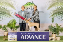 | Very promising in every way. Beautifully constructed front and rear, lovely proportions. Head proportions excellent. Small, well-placed ears. Eye placement correct. Strong muzzle with excellent finish. Beautiful feet. Holds level topline. Good tailset and carriage. |
