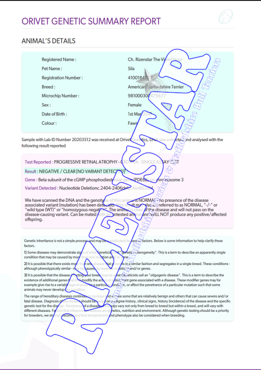 * Clear by Parentage - Parents are tested and dog has been DNA Parentage tested to 100% prove the results.
