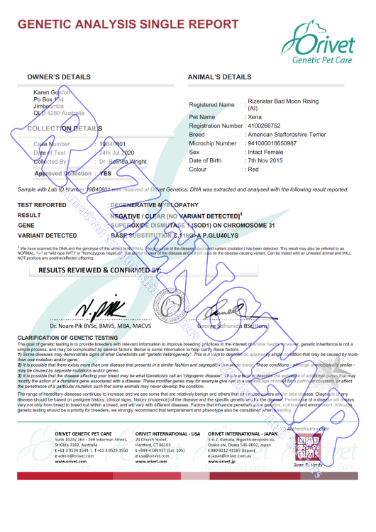Aust Ch. Rizenstar The Violet Hour DNA-P | DNA-PA | NCL-A Clear | HUU Clear by Parentage | DM Clear by Parentage | PRA (1) Clear | PRA (2) Clear |